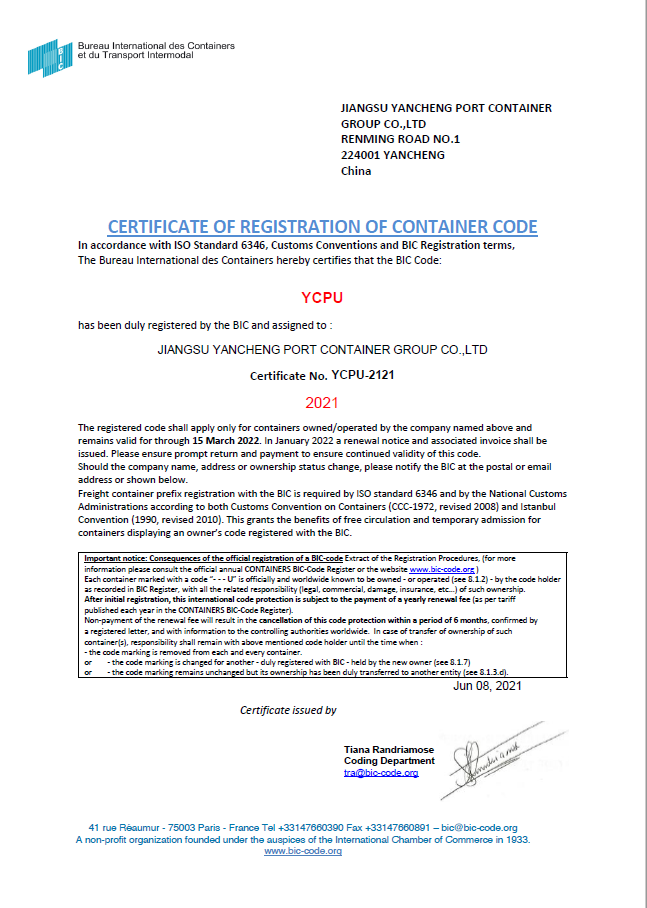 6月10日,從國際集裝箱局(法國)傳來喜訊,鹽城港集團自備的200只集裝箱,全部完成前綴YCPU的注冊登記手續(xù)(證書編號:YCPU-2121),正式成為可以全球流通的集裝箱。自此,鹽城港自備箱在世界上有了自己的名字—“YCPU”,拿到了自己的“環(huán)球通行證”。