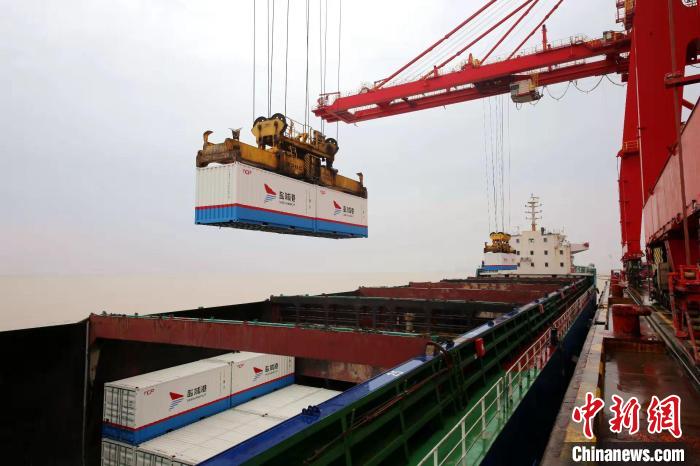 裝載農副產品的貨輪駛向上海?!←}城港集團供圖