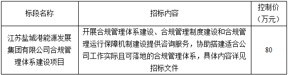 江蘇鹽城港能源發(fā)展集團(tuán)有限公司合規(guī)管理體系建設(shè)項(xiàng)目已經(jīng)相關(guān)部門批準(zhǔn)實(shí)施, 項(xiàng)目所需資金來源自籌已落實(shí)。現(xiàn)決定對該項(xiàng)目進(jìn)行公開招標(biāo),擇優(yōu)選定承包人。