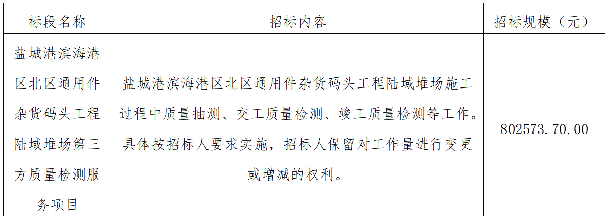⑴項(xiàng)目名稱:鹽城港濱海港區(qū)北區(qū)通用件雜貨碼頭工程陸域堆場(chǎng)第三方質(zhì)量檢測(cè)服務(wù)項(xiàng)目