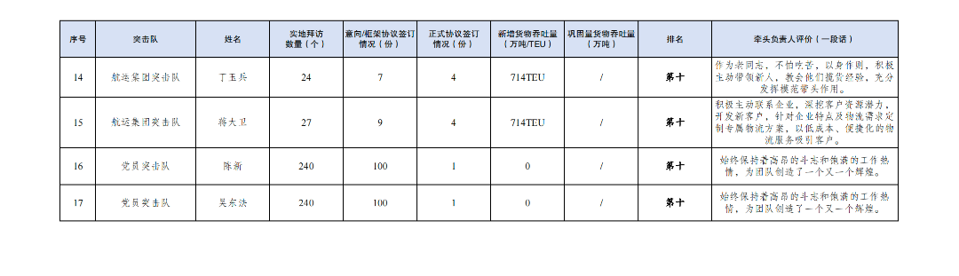 第一名:巾幗突擊隊(duì) 李婷婷(拜訪客戶228家,簽訂意向協(xié)議52份,簽訂正式協(xié)議5份,新增貨物吞吐量48TEU,鞏固量貨物吞吐量268TEU)