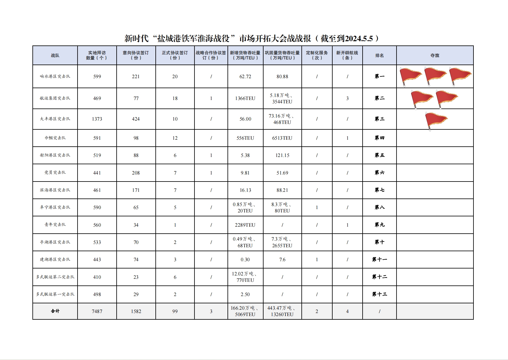1.累計拜訪客戶數(shù)量7487家:其中大豐港區(qū)突擊隊1373家,響水港區(qū)突擊隊599家,巾幗突擊隊591家,阜寧港區(qū)突擊隊590家,青年突擊隊560家,亭湖港區(qū)突擊隊533家,射陽港區(qū)突擊隊519家,多式聯(lián)運第一突擊隊498家,航運集團突擊隊469家,濱海港區(qū)突擊隊461家,建湖港區(qū)突擊隊443家,黨員突擊隊441家,多式聯(lián)運第二突擊隊410家。