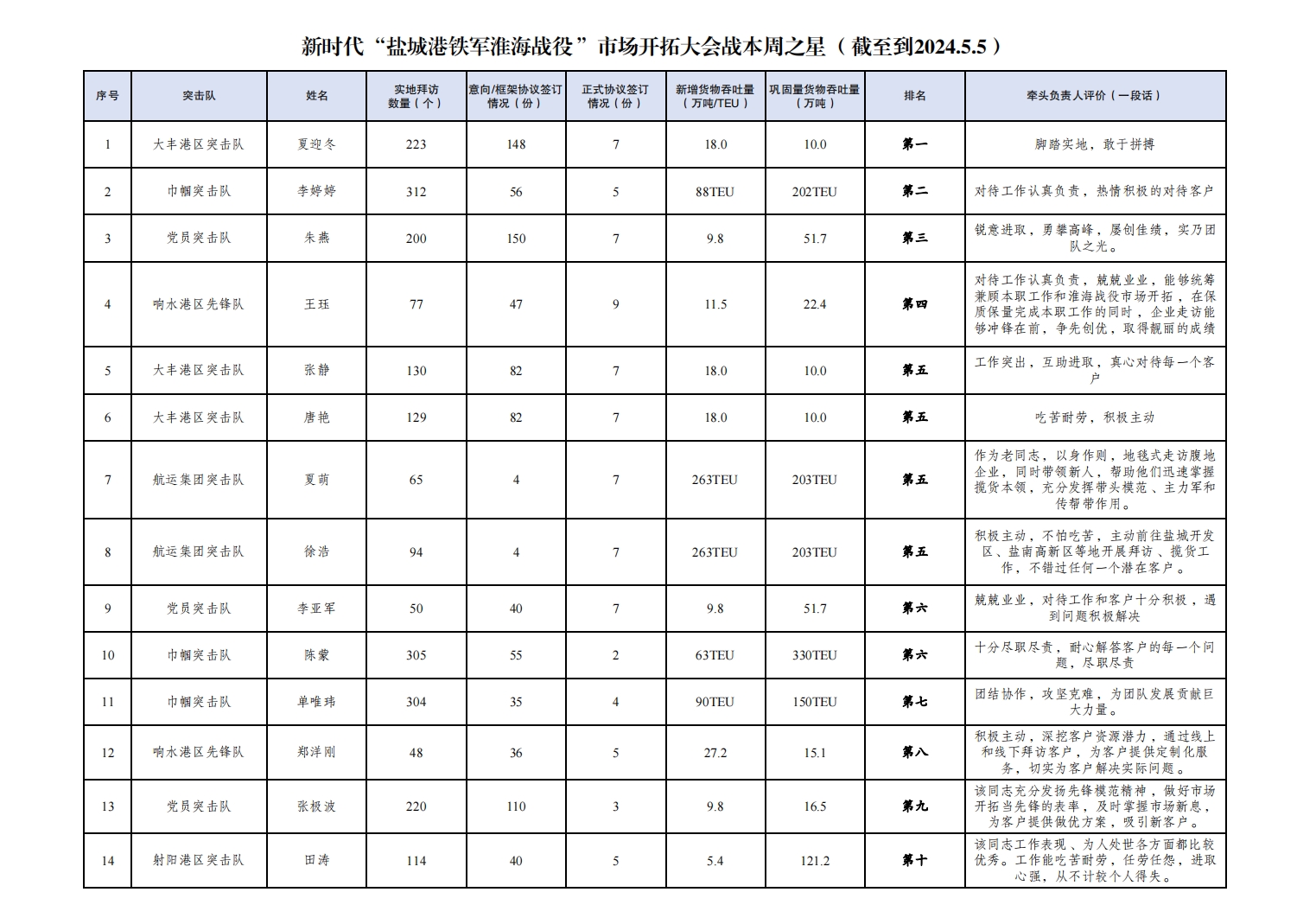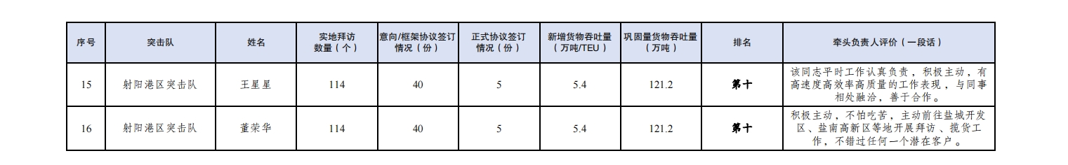 第一名:大豐港區(qū)突擊隊 夏迎冬(拜訪客戶223家,簽訂意向協(xié)議148份,簽訂正式協(xié)議7份,新增貨物吞吐量18萬噸,鞏固量貨物吞吐量10萬噸);