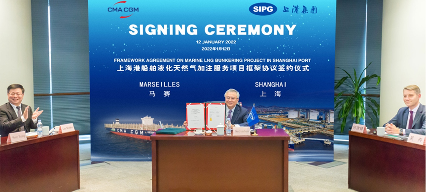 上海國際港務(集團)股份有限公司(“上港集團”)與法國達飛海運集團(“達飛集團”)于2022年1月12日舉行了上海港船舶液化天然氣(LNG)加注服務項目框架協議簽約儀式,上港集團董事長顧金山與達飛集團董事長、首席執行官魯道夫·薩德出席。
