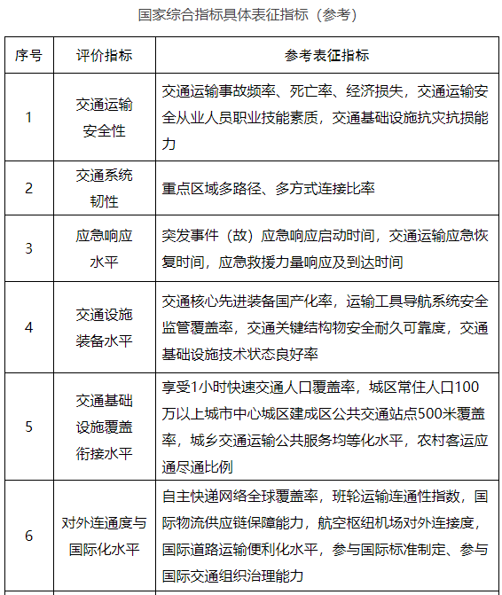 為深入貫徹落實《交通強國建設綱要》《國家綜合立體交通網規劃綱要》,客觀評估交通強國建設進程,充分發揮評價指標體系的“標尺”和“指揮棒”作用,科學引導各地區、各行業加快建設交通強國,我們研究制定了《交通強國建設評價指標體系》,經報國務院領導同志同意,現予印發。