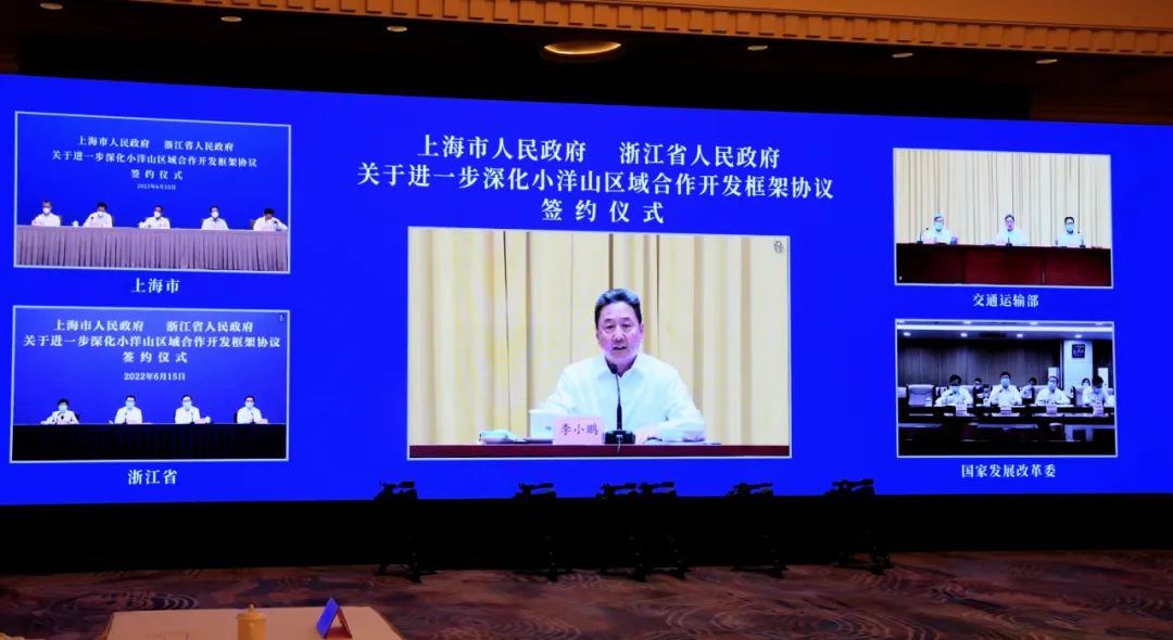 6月15日下午,上海市政府與浙江省政府以視頻連線方式正式簽署進一步深化小洋山區(qū)域合作開發(fā)框架協議。上海市委書記李強、浙江省委書記袁家軍和交通運輸部部長李小鵬、國家發(fā)展改革委副主任胡祖才出席簽約活動并講話。上海市委副書記、市長龔正,浙江省委副書記、省長王浩共同簽署協議。