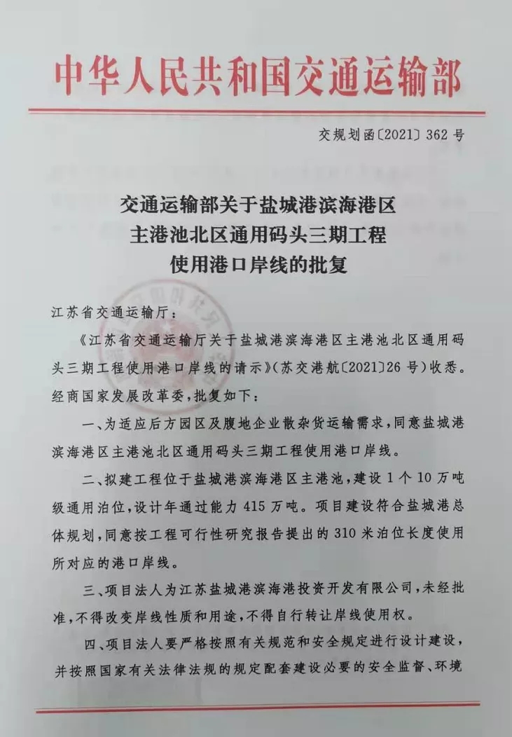 近日,交通運(yùn)輸部批復(fù)鹽城港濱海港區(qū)主港池北區(qū)通用碼頭三期工程使用港口岸線的請(qǐng)示(交規(guī)劃函〔2021〕362號(hào))、省發(fā)展改革委批復(fù)鹽城港濱海港區(qū)北港池防波堤一期工程可行性研究報(bào)告(蘇發(fā)改基礎(chǔ)發(fā)〔2021〕672號(hào)),標(biāo)志濱海港區(qū)重大項(xiàng)目前期工作取得突破性進(jìn)展。
