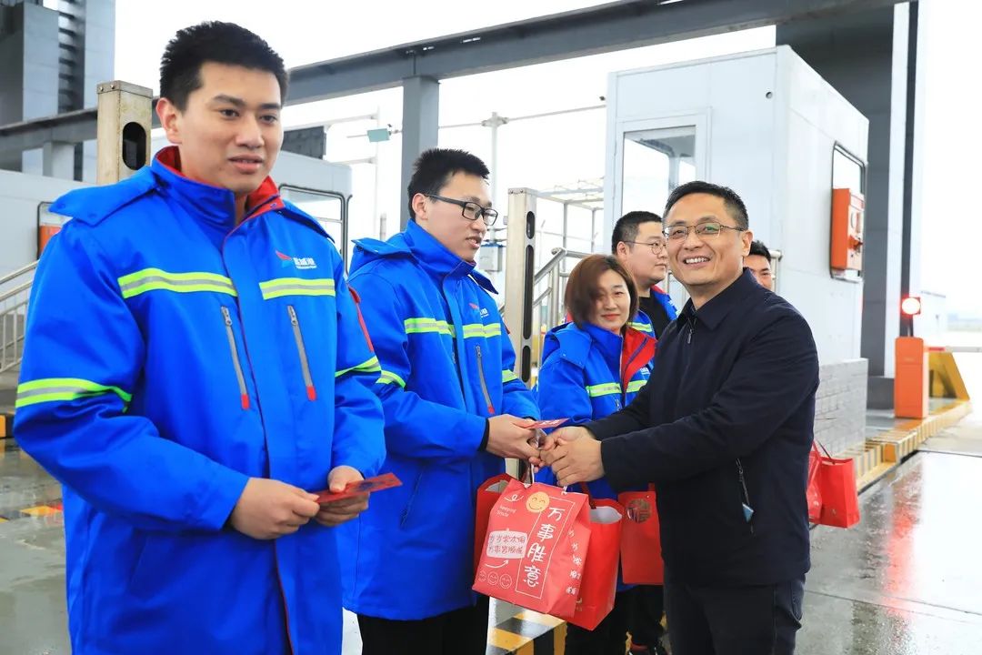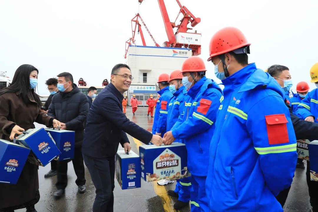 1月22日,大年初一,碼頭一線到處洋溢著節(jié)日喜慶氣氛。受集團(tuán)黨委、董事會(huì)委托,當(dāng)天上午,集團(tuán)黨委副書記、董事、總經(jīng)理陸帥率隊(duì)前往大豐港區(qū)看望慰問堅(jiān)守在一線工作崗位的工作人員,代表集團(tuán)黨委、董事會(huì)向他們致以新春的祝福和節(jié)日的問候。鹽城海關(guān)二級高級主辦李健,集團(tuán)副總經(jīng)理袁欣等參加。