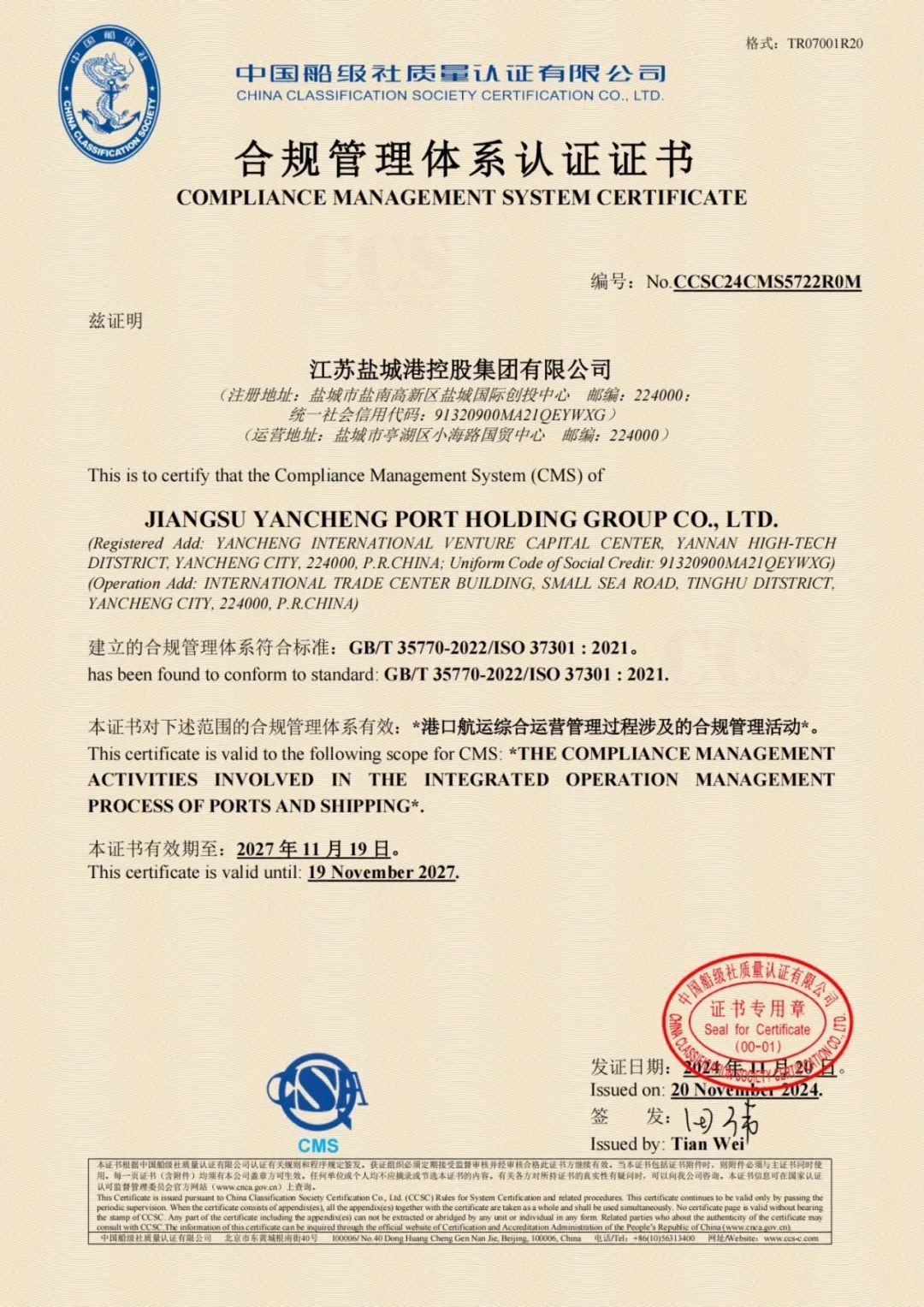 11月22日,鹽城港集團(tuán)順利通過(guò)中國(guó)船級(jí)社質(zhì)量認(rèn)證有限公司(CCSC)的合規(guī)管理體系審核認(rèn)證,獲得合規(guī)管理體系認(rèn)證證書(shū),成為江蘇省首家獲得合規(guī)管理體系證書(shū)的港航企業(yè)。