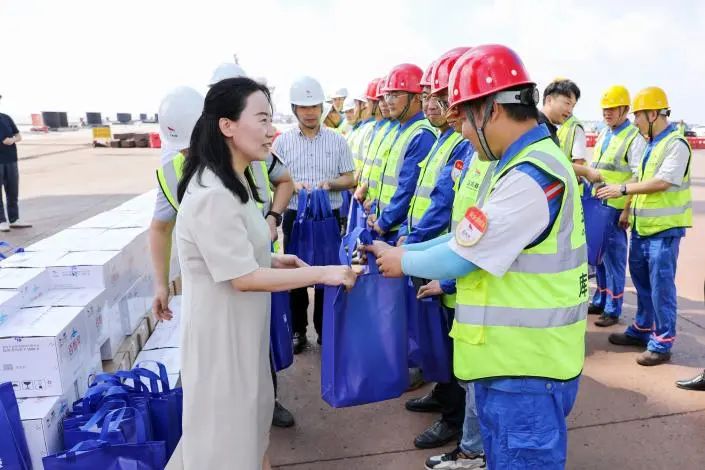 活動現(xiàn)場,袁欣與大家親切交談,詳細(xì)詢問一線職工的工作狀態(tài)和實(shí)際需求,對他們頂烈日、戰(zhàn)酷暑,始終堅(jiān)守崗位的敬業(yè)精神表示衷心感謝,叮囑他們要注意防暑降溫,做好個人防護(hù),并將防暑降溫“清涼禮包”送到職工代表手上。她說,當(dāng)前高溫、惡劣天氣逐漸增多,各單位要切實(shí)做好夏季防暑降溫工作,動態(tài)調(diào)整作業(yè)時間,為廣大員工提供清涼舒心的休息場所,全面保障人身安全。同時,要時刻繃緊安全這根弦,聚焦生產(chǎn)、消防重點(diǎn)領(lǐng)域,常態(tài)化開展安全隱患排查治理工作,做好值班值守和應(yīng)急處置,確保港區(qū)安全生產(chǎn)形勢穩(wěn)定。
