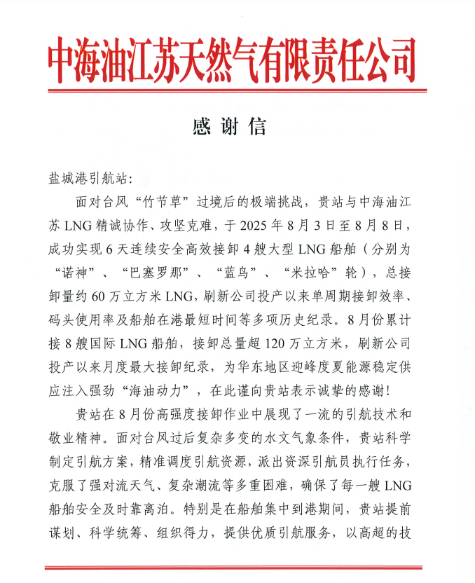 近日,鹽城港引航站收到中海油江蘇天然氣有限責(zé)任公司發(fā)來的感謝信。信中對引航站在臺風(fēng)“竹節(jié)草”過境后的復(fù)雜局面下,高效完成LNG船舶接卸任務(wù)的專業(yè)服務(wù)予以高度認(rèn)可,特別提及創(chuàng)下的多項(xiàng)紀(jì)錄,生動展現(xiàn)了引航站作為“水上國門”守護(hù)者,在區(qū)域能源供應(yīng)中的硬核擔(dān)當(dāng)。