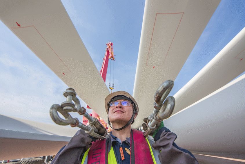 射陽港口碼頭工人在進行風電葉片轉船檢查