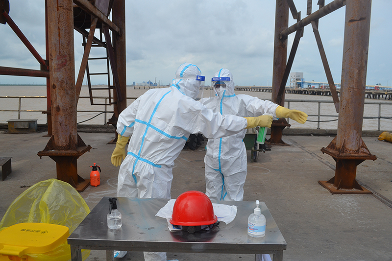 培訓中,安全總監陳國慶介紹了穿脫防護服的重要性和注意事項,向參訓人員詳細講解手部消毒、防護服穿脫流程步驟、醫療廢物袋封口鵝頸式打法,并對防護服穿脫過程中出現各種突發情況進行說明。結合講解,安全員現場演示了具體操作細節。副總經理林峰對各作業區經理防護服穿脫及醫療廢物袋封口鵝頸式打法進行現場點評。總經理季曉波要求所有一線人員要高度重視疫情防控工作,熟練掌握個人防護用品的正確使用方法及注意事項,進一步加強疫情防控意識,提高自我防護能力。