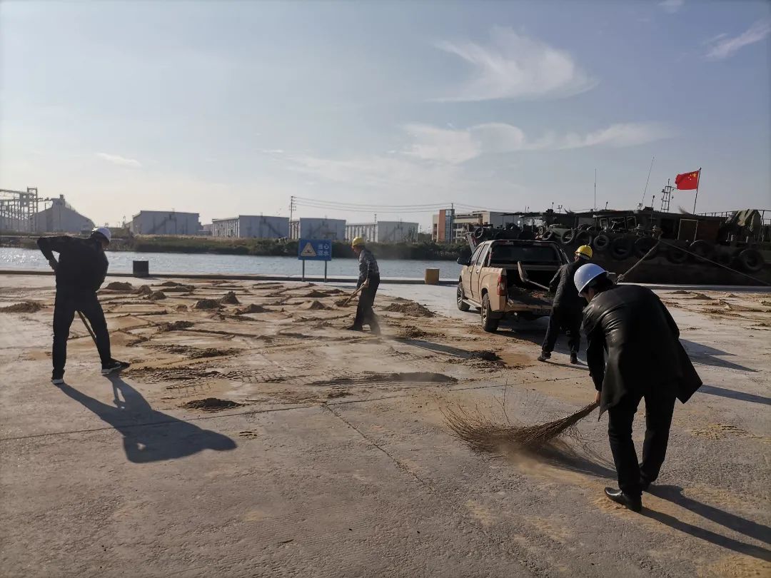 航運(yùn)(集裝箱)集團(tuán)在首次承接的黃砂集改散業(yè)務(wù)中。26個集裝箱小柜近800噸黃砂僅用時3.6小時就完成作業(yè),順利交貨,生產(chǎn)調(diào)度中心及運(yùn)營操作部負(fù)責(zé)人全部在一線負(fù)責(zé)指揮調(diào)度,并在作業(yè)完成后,為了不影響場地的后續(xù)使用,帶頭扛起鐵鍬沖到現(xiàn)場清理,經(jīng)過近2小時的清理,3余噸的殘余沙石貨物全部清理完畢,不僅得到了貨主的贊揚(yáng),也向所有同事及兄弟單位展現(xiàn)了有困難一起上,見石頭齊心抬的團(tuán)隊精神。