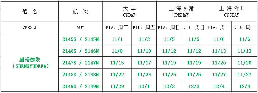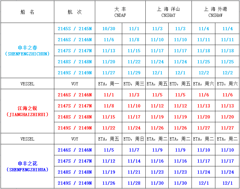 滬鹽專(zhuān)線2021年11月份沿海線船期表