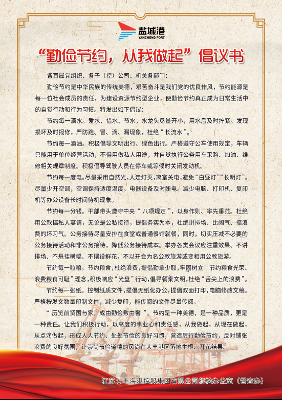為進一步提高廣大干部職工對保持“艱苦奮斗、勤儉節約”重要性的認識,推動建設節約型企業,形成“人人講節約、事事講節約”的良好風尚。12月4日,大豐港區組織開展“勤儉節約、從我做起”主題實踐活動。
