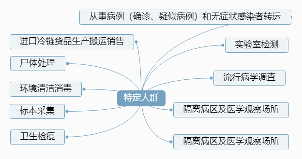 6.“特定人群”:在新冠肺炎疫情期間,從事病例(確診、疑似病例)和無癥狀感染者轉(zhuǎn)運(yùn)、尸體處理、環(huán)境清潔消毒、標(biāo)本采集、實(shí)驗(yàn)室檢測、流行病學(xué)調(diào)查、隔離病區(qū)及醫(yī)學(xué)觀察場所、衛(wèi)生檢疫、進(jìn)口冷鏈貨品生產(chǎn)搬運(yùn)銷售等工作的人群。