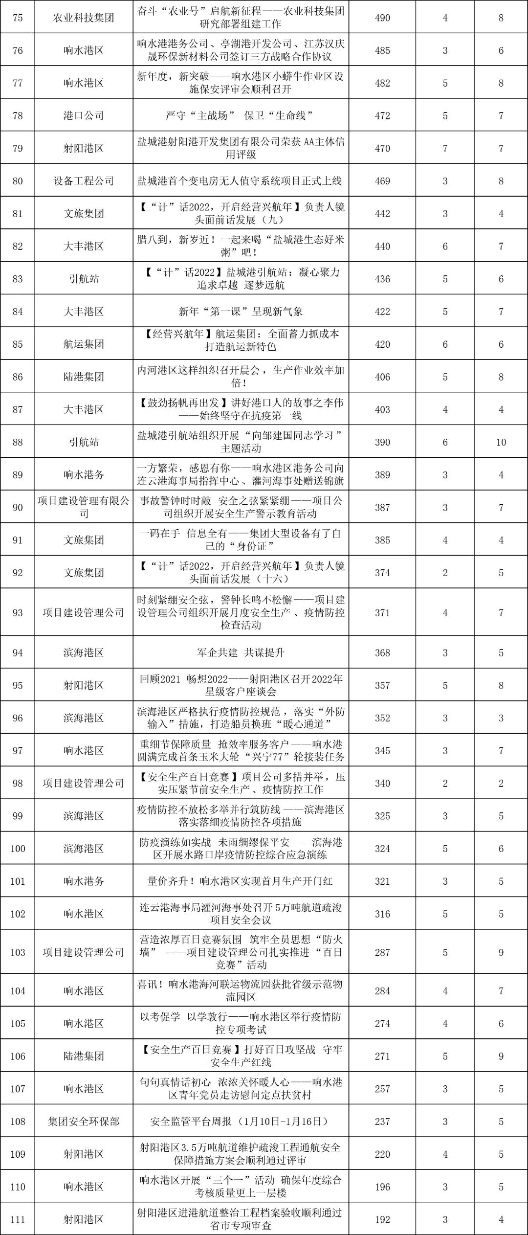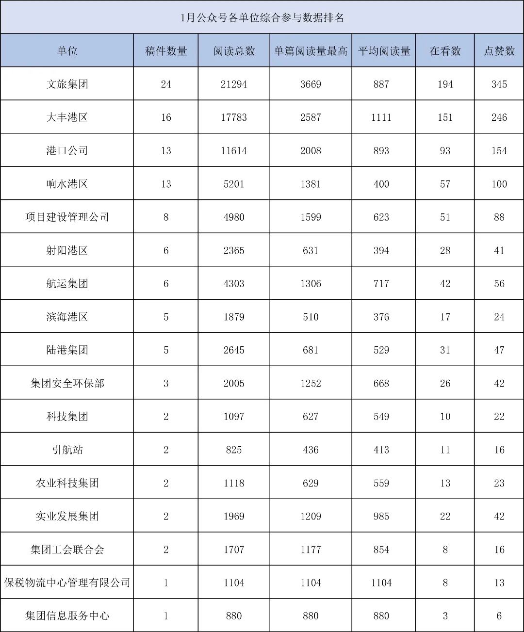 1月,“江蘇鹽城港控股集團”微信公眾號推送文章170篇,截至目前,閱讀總量14萬+,各單位供稿111篇。其中,文旅集團以2.1萬閱讀數,24篇稿件量,遙遙領先;大豐港區以1.8萬閱讀數,16篇稿件量,位列第二;港口公司、響水港區在供稿方面,以同樣13篇的數量并列第三,在閱讀量方面,港口公司以1.2萬的數量,位列單項第三;其他港口及板塊集團積極參與,踴躍投稿,情況較好。