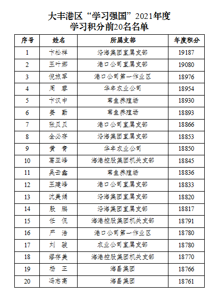 新的一年,為表彰先進(jìn)、激勵后進(jìn),持之以恒地提高港區(qū)全體干部職工的學(xué)習(xí)自覺性和主動性,進(jìn)一步加強(qiáng)學(xué)習(xí)型黨組織建設(shè)。近日,大豐港區(qū)舉行“學(xué)習(xí)強(qiáng)國”2021年度先進(jìn)個人頒獎儀式,根據(jù)“學(xué)習(xí)強(qiáng)國”APP大豐港區(qū)年度學(xué)習(xí)積分排名,對成績突出的前20名“學(xué)習(xí)達(dá)人”代表進(jìn)行了表彰,并頒發(fā)榮譽(yù)證書。