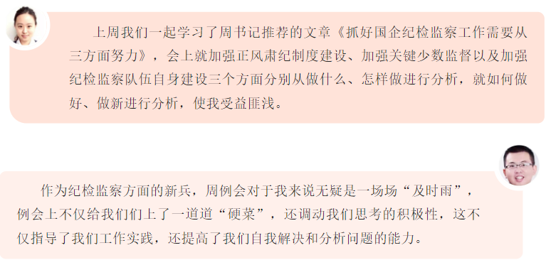 紀檢監(jiān)察業(yè)務周例會是大豐港區(qū)提高紀檢條線工作能力的方式,也是建設學習型紀檢干部的有效嘗試。“學習要有干貨,不能搞花架子,要了解我們的干部最需要學什么,緊貼實際需求和工作要求來安排學習內(nèi)容。”大豐港區(qū)紀檢相關負責人表示,深化監(jiān)察體制改革,對紀檢監(jiān)察干部的業(yè)務能力提出了更高更嚴的要求,學習就是要著力補短板、強弱項,解決紀檢監(jiān)察干部本領“恐慌”問題。例會上,就集團紀委下發(fā)文件精神進行剖析、對日常監(jiān)督如何抓、信息宣傳選題立意、特色亮點提煉歸納進行培訓。會上還提倡“我的問題大家答”,組織交流討論、現(xiàn)場解答,鼓勵善于發(fā)現(xiàn)問題,積極解決問題,創(chuàng)新理念思路,確保可以“充電補能”,提升業(yè)務能力。