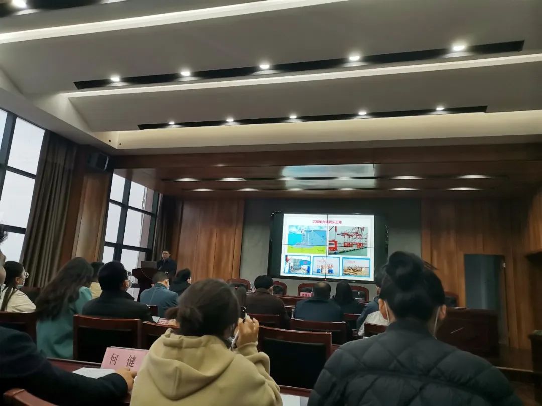 “業務大講堂”由港區相關負責同志進行主講,他以《淺談高樁碼頭建設過程》為題,結合響水港區小蟒牛作業區碼頭二期工程(4#、5#泊位)項目建設的實際情況,圍繞岸坡挖泥施工、灌注樁施工、水上沉樁施工、現澆樁帽施工、預制構件施工及安裝等方面內容,通過文字、圖片、視頻相結合的方式,深入淺出地為機關干部職工作了系統地講解,內容豐富,干貨滿滿。