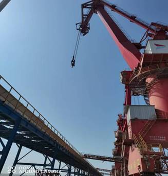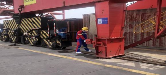 隨著一聲指令的下達,演練正式開始,糧食碼頭1#泊位“騰海明宇”輪作業過程中突然接上級通知,碼頭1小時后將突發強對流天氣,伴有雷電、大風、暴雨等緊急情況?,F場調度立即啟動突發極端天氣機械設備防風錨定應急預案,門機停止作業、抓斗降至碼頭面、更換鉤頭、放下行走錨定,保障人員拉起門機防風拉索、安全巡查員對各處防風錨定情況進行再檢查、作業車輛就地停車并開啟雙閃、設備維護組人員全部保持待命搶修狀態。在場人員分工明確、各司其職、井然有序,僅用10分鐘,所有機械錨定任務全部完成,所有作業人員撤離到安全區域進行復盤點評,演練圓滿結束。