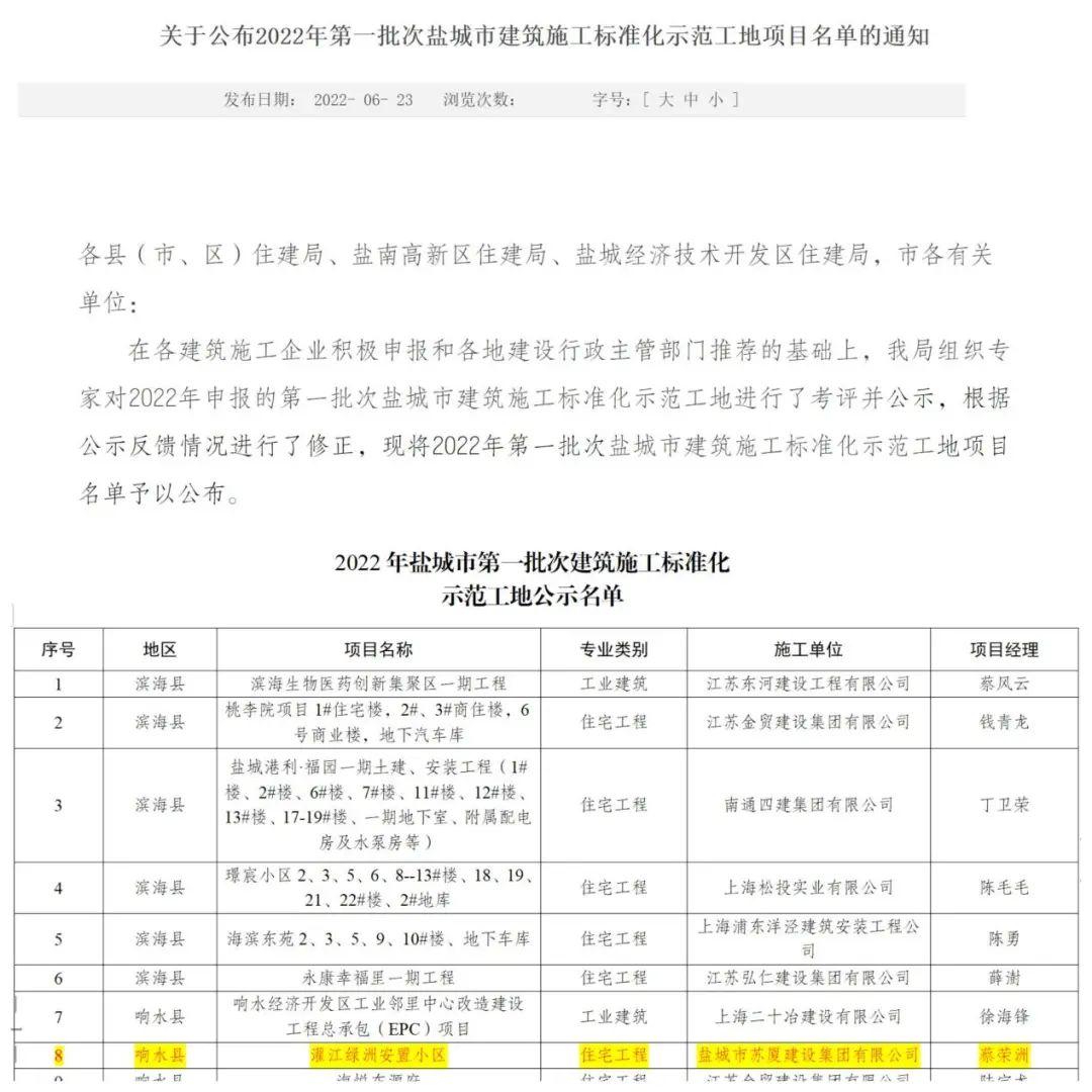 日前,江蘇省鹽城市住房和城鄉(xiāng)建設(shè)局公布2022年第一批次鹽城市建筑施工標(biāo)準(zhǔn)化示范工地項目名單,由項目管理公司代管的響水縣灌江綠洲安置小區(qū)項目榮獲“鹽城市建筑施工標(biāo)準(zhǔn)化示范工地”稱號。
