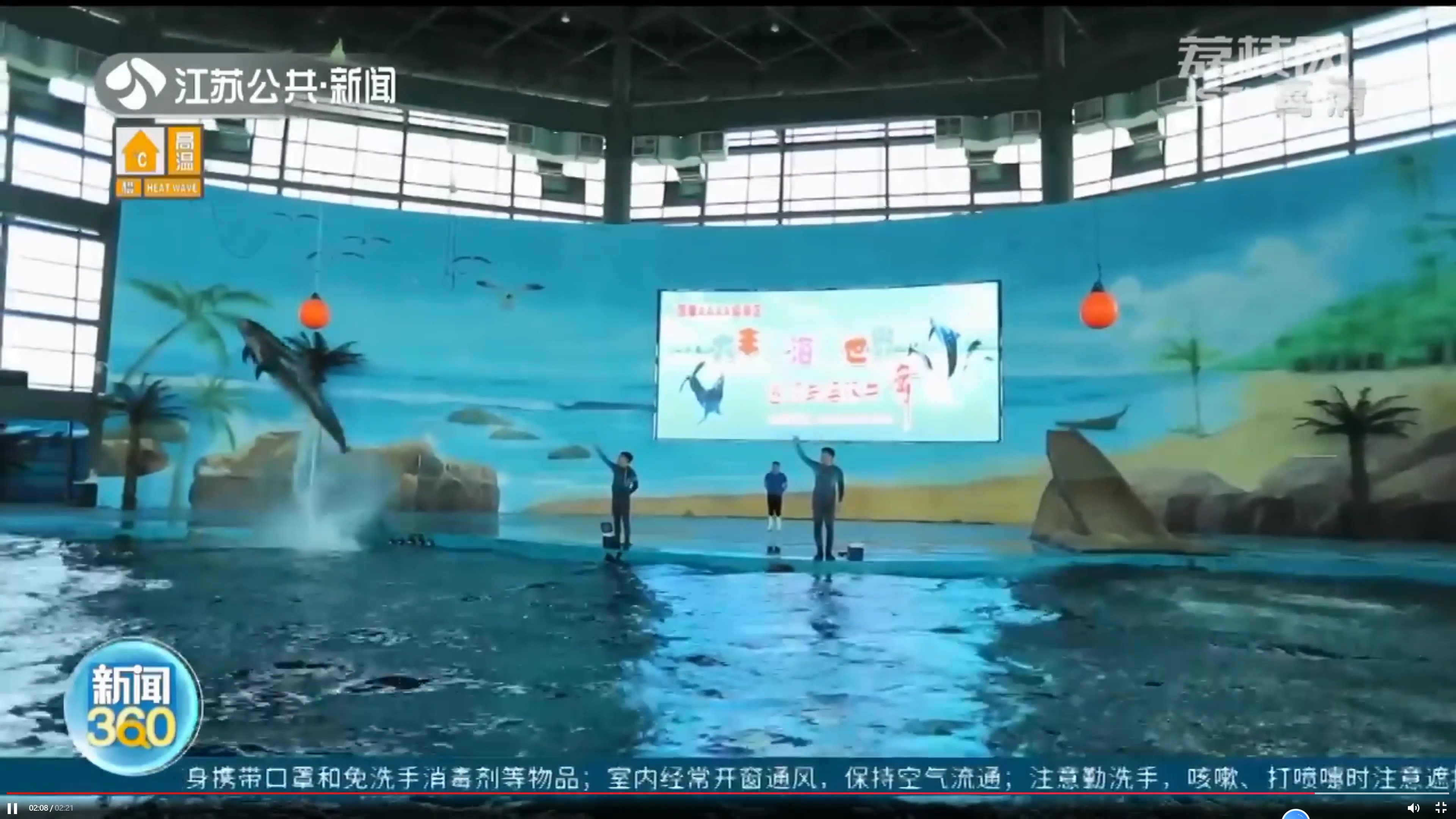 新聞中展示了鹽城港海洋館內(nèi)的馴養(yǎng)員與海豚互動(dòng)表演,馴養(yǎng)員時(shí)而騎在海豚身上,讓海豚在水池中快速滑翔,時(shí)而指揮海豚,讓海豚在水池中高高躍起擊中懸掛的氣球,憨態(tài)可掬又靈活精怪的海豚帶來(lái)的精彩表演引來(lái)現(xiàn)場(chǎng)觀眾陣陣喝彩。