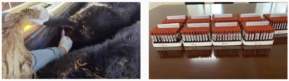 血樣采集是確保檢測工作準確無誤的基礎,更是嚴防境外動物傳染病傳入國門的第一道防線。為保證采血檢疫工作的順利完成,駐場海關人員、及牧業公司駐場人員在炎熱高溫的天氣下,穿著隔離防護衣,佩戴面罩、口罩、手套持續工作。每天采集1200-1400管血樣,確保在96小時內完成所有牛只血樣采集工作。