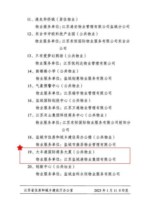 近日,江蘇省住房和城鄉(xiāng)建設(shè)廳公布2021年度省級示范物業(yè)管理項目名單,“鹽城港大豐港國際商務(wù)大廈(公共物業(yè))”被評價為“2021年度省級示范物業(yè)管理項目”,該項目由鹽城港物業(yè)集團有限公司提供管理服務(wù),該榮譽是江蘇省物業(yè)管理行業(yè)省級最高榮譽。