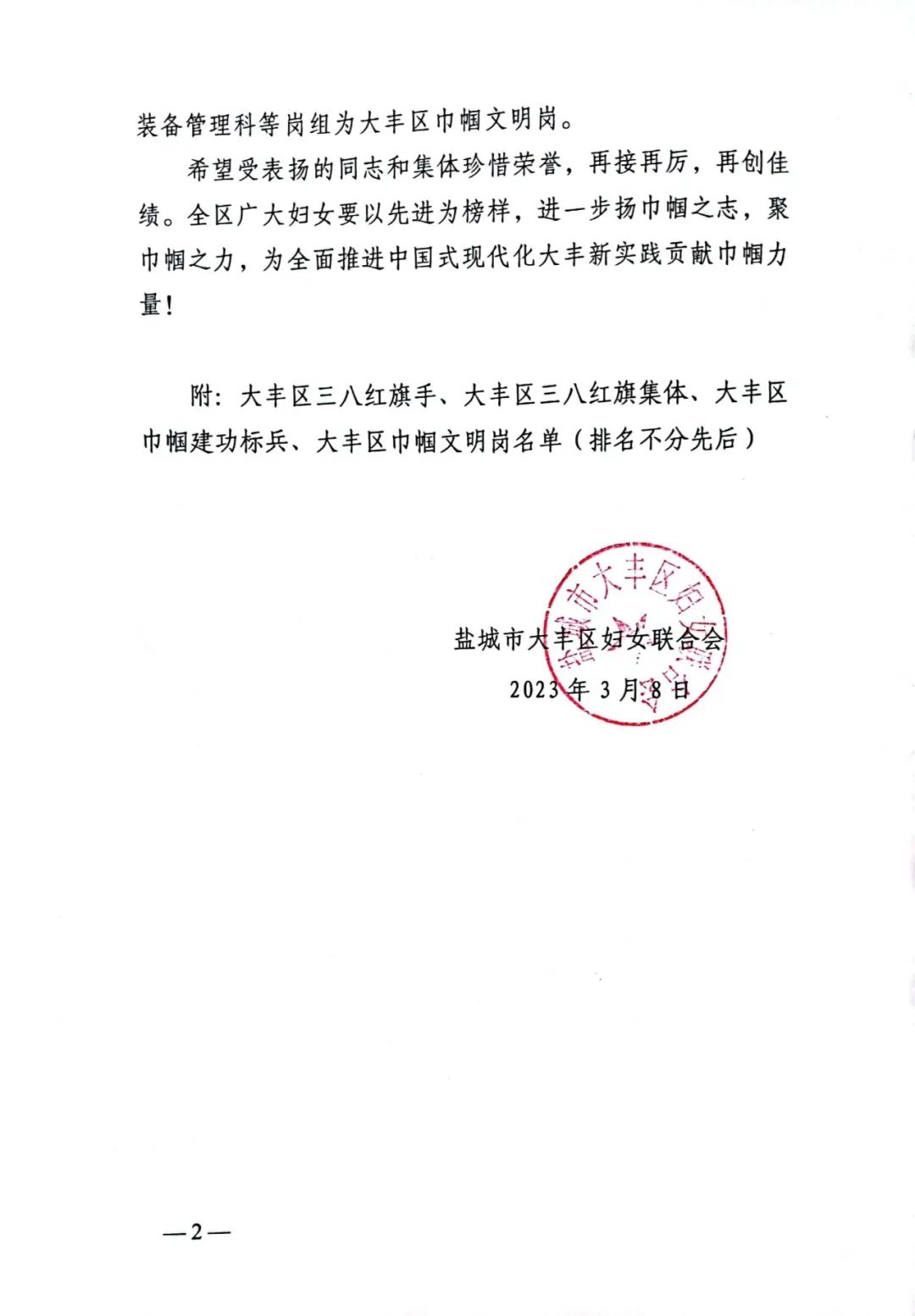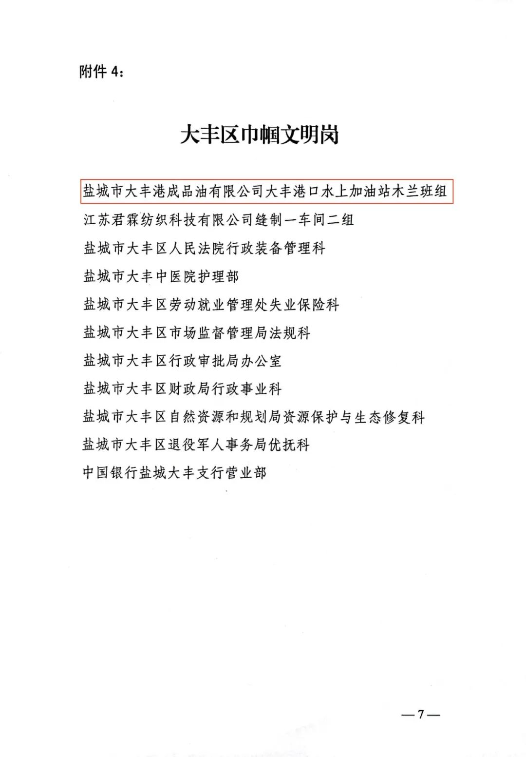 近日,大豐區婦女聯合會發表《關于表揚2022年度大豐區三八紅旗手(集體)和大豐區巾幗建功標兵、巾幗文明崗的通報》,鹽城港大豐港區成品油公司水上加油站“木蘭”班組榮獲“巾幗文明崗”榮譽稱號,班組成員王亞敏榮獲“三八紅旗手”榮譽稱號。