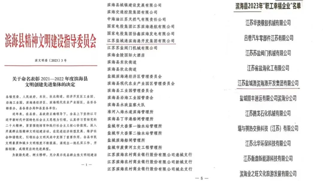 近日,濱??h總工會公示了提升職工生活品質2021—2022年度縣文明創建先進集體、2023年濱??h“職工幸福企業”名單,濱海港區再獲兩項榮譽。