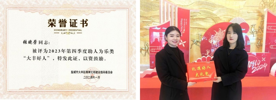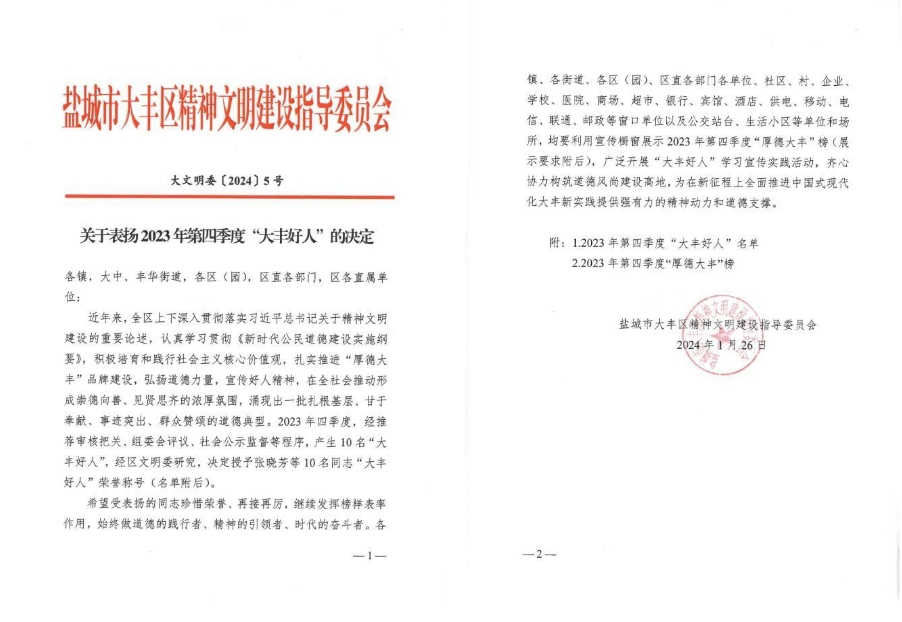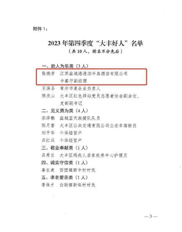 近日,鹽城市大豐區(qū)大力培育和踐行社會(huì)核心價(jià)值觀,積極開展2023年第四季度“大豐好人”推薦評(píng)選表彰活動(dòng),著力唱響“厚德大豐”品牌。經(jīng)推薦審核把關(guān)、組委會(huì)評(píng)議、社會(huì)公示監(jiān)督等程序,江蘇鹽城港港泊半島酒店有限公司張曉芳同志被授予“大豐好人”榮譽(yù)稱號(hào)。