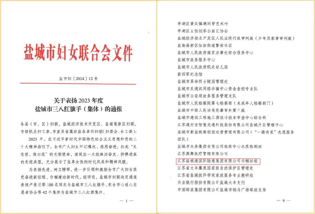 近日,鹽城市婦女聯(lián)合會發(fā)布《關(guān)于表揚2023年度鹽城市三八紅旗手(集體)的通報》,江蘇鹽城港國際陸港集團有限公司巾幗班組被評為“2023年度鹽城市三八紅旗集體”。