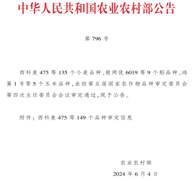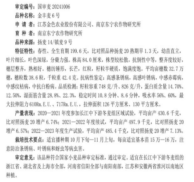 近日,農(nóng)業(yè)農(nóng)村部發(fā)布第五屆國(guó)家農(nóng)作物品種審定委員會(huì)第四次主任委員會(huì)會(huì)議審定通過(guò)的作物品種,農(nóng)業(yè)科技集團(tuán)所屬金色農(nóng)業(yè)選育的小麥新品種“金豐麥6號(hào)”通過(guò)國(guó)家審定。