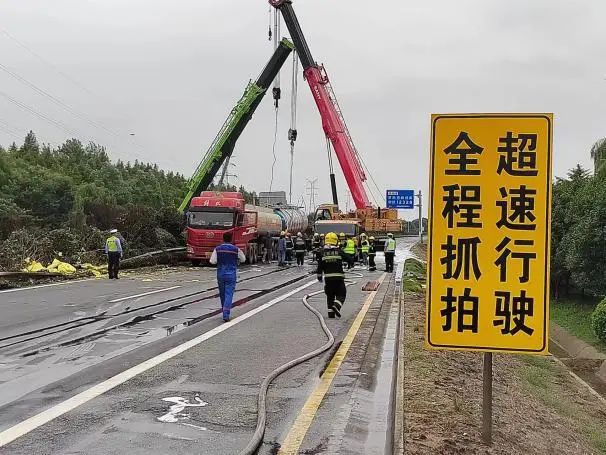 根據現場險情,公安交警部門第一時間封鎖事故現場,禁止一切車輛靠近,消防大隊出動消防車對事故車輛罐體進行噴射冷卻,聯系吊車對其進行罐體扶正工作,隨后由危化品運輸公司救援搶險隊使用相關設備將泄漏罐車內的“高沸點芳烴”進行抽取,并轉移至指定安全區域。
