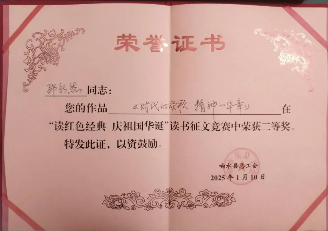 近日,由響水縣總工會(huì)舉辦的2024年度“讀紅色經(jīng)典、慶祖國華誕”職工讀書征文競賽活動(dòng)結(jié)果相繼公布,江蘇響水港物流有限公司業(yè)務(wù)組邵新然的《時(shí)代的頌歌,精神的華章》在眾多作品中脫穎而出,榮獲征文競賽二等獎(jiǎng)。
