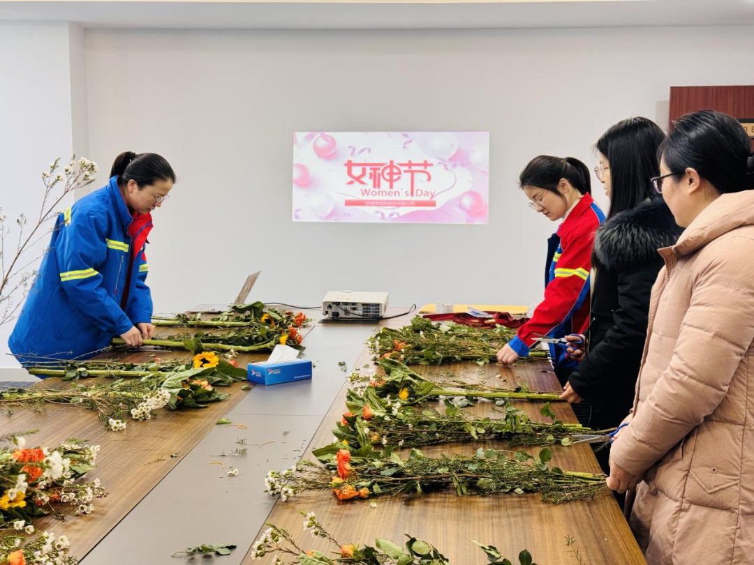 國際股份公司舉辦插花與觀影活動。女職工們以康乃馨、向日葵等花材創作藝術作品,盡顯溫婉與豪情;通過觀看《哪吒之魔童鬧?!罚橙?“打破偏見、銳意進取” 的精神力量,為集團發展注入巾幗動力。