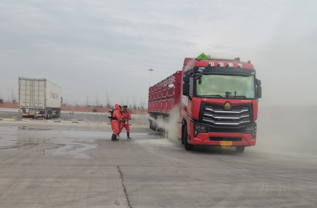 演練模擬危險品運輸車輛液體泄漏引發火災場景。停車場消控中心接警后,現場負責人立即啟動應急預案,組織現場勘查并上報應急指揮中心。指揮中心迅速響應,組織園區救援隊伍開展初期火災撲救和人員疏散,同時引導消防救援隊伍支援。演練中,各參演單位分工明確,配合有序。救援人員身著防化服實施現場警戒和人員疏散,啟用泡沫滅火系統控制火勢,最終成功撲滅火災。隨后,使用空氣檢測設備對現場進行全面檢測,確保環境安全。整個演練流程規范、處置高效,有效檢驗了應急處置能力。
