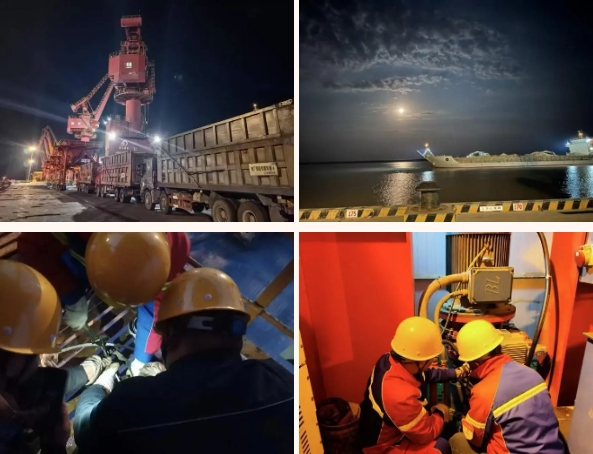 星斗轉移間,港區燈火織就金色蛛網。維保員謝凱登上7#門機,在操作司機進行作業前試運行時,由下而上逐項檢查“四大機構”各鉸點工況,這個已經從業達十年的“設備醫生”,各個異常部件,都逃不過他的“聽診”;此刻,碼頭上4臺門機、16輛短駁車輛正接受作業前深度“體檢”,設備完好率99.9%的紀錄在月光下悄然刷新;遠處傳來貨輪悠長的汽笛,現場調度員使用高頻指揮著船舶乘潮進港,用精準、精致將潮汐、貨種、作業效能編織成最優解的算式。