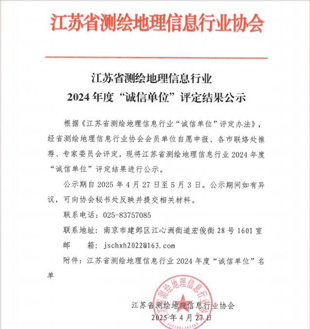 近日,江蘇省測繪地理信息協(xié)會正式發(fā)布2024年度行業(yè)"誠信單位"評選結(jié)果,鹽城港港航勘測設(shè)計有限公司憑借卓越的誠信經(jīng)營表現(xiàn)和專業(yè)技術(shù)實(shí)力,成功獲評此項殊榮,不僅是對企業(yè)誠信體系建設(shè)的高度認(rèn)可,更是對其在測繪地理信息領(lǐng)域?qū)I(yè)能力和服務(wù)質(zhì)量的全面肯定。