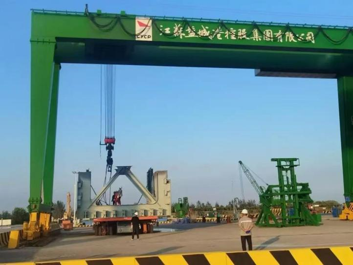 阜寧港區深耕大件匠心鑄就標桿,憑借精湛的技術和優質的服務,成功完成濱富重工超80噸鋼板裝卸任務,與神山重工達成5萬噸LNG碼頭管樁訂單合作,首批貨物已搭載巨輪駛向德國庫克斯港,在國際舞臺上展現“陸港力量”。
