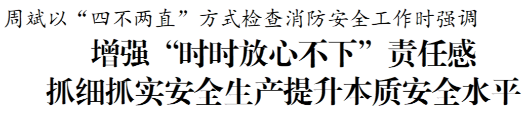 6月27日下午,市委書記周斌以“四不兩直”方式檢查消防安全工作。他強調(diào),要深入學習貫徹習近平總書記關(guān)于安全生產(chǎn)和消防工作的重要論述,按照省市委部署要求,時刻繃緊安全生產(chǎn)這根弦,增強“時時放心不下”的責任感和“事事心中有底”的行動力,抓實抓細隱患排查整治,壓緊壓實各方責任,全面筑牢安全防線,切實維護人民群眾生命財產(chǎn)安全。