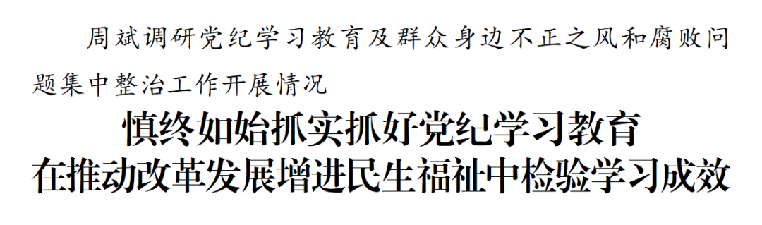 周斌在調研中指出,黨紀學習教育要強化原文研學,深學細悟習近平總書記關于全面加強黨的紀律建設的重要論述,堅持融入日常、抓在經常,持續在深化內化轉化上下功夫,引導黨員干部更好把遵規守紀刻印在心。要強化警示教育,用好紅色資源、鮮活案例和生動現場,加強正面引導和反面警示,讓黨員干部受警醒、明底線、知敬畏,真正做到知行知止。要強化學用結合,堅持兩手抓、兩促進,將黨紀學習教育與整治形式主義為基層減負、整治群眾身邊不正之風和腐敗問題、推進經濟社會高質量發展相結合,在嚴格約束下積極擔當作為,切實把學習成效轉化為推動改革發展、增進民生福祉的實際舉措,真正讓黨員受教育、發展見成效、群眾得實惠。