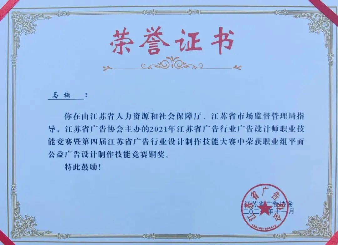 11月28日,從2021年江蘇省廣告行業(yè)廣告設(shè)計師職業(yè)技能競賽暨第四屆設(shè)計制作技能大賽上傳來好消息,由江蘇鹽城港文化傳媒有限公司選送的參賽選手,經(jīng)過現(xiàn)場理論、實際創(chuàng)作等環(huán)節(jié)的比拼,在此次省級一類大賽中分別獲得職業(yè)組平面公益廣告設(shè)計銅獎、職業(yè)組影視公益廣告設(shè)計制作銅獎,為公司進一步提升品牌影響力增添了濃墨重彩的一筆,為“50天大比武活動”交上了一份優(yōu)異的答卷。